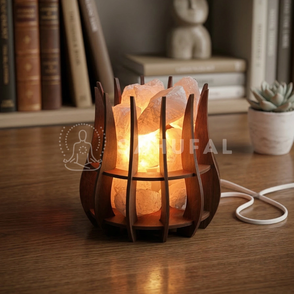 Cuando la lámpara se enciende, la luz atraviesa los cristales creando un efecto luminoso natural que resalta la belleza única de cada piedra. Su diseño decorativo con madera calada la convierte en una pieza perfecta tanto para decoración espiritual como para ambientación moderna.