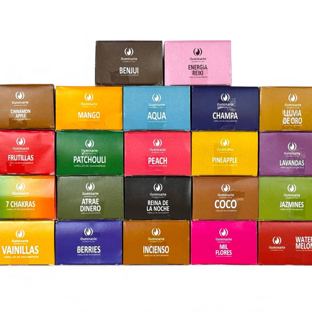 💰 Atrae Dinero · 🌈 7 Chakras · ✨ Energía Limpia · 🌿 Palo Santo · 🕯️ Incienso · 🌊 Aqua · 🍓 Frutillas · 🫐 Berries · 🔮 Energía Reiki · 🌟 Lluvia de Oro · 🌙 Reina de la Noche · 🍦 Vainillas · 🍉 Water Melon · 🥭 Mango · 🌸 Mil Flores · 🍋 Limón · 🍍 Pineapple · 🕉️ Champa · 🧿 Mirra Consagrada · 🍑 Peach · 🥥 Coco · 🍋‍🟩 Lime · 🌿 Lemon Grass · 🌿 Patchouli · 🌿 Salvia Blanca · 🍎🌿 Cinnamon Apple · 🦟 Citronella · 🌼 Jazmines · 🌳 Sándalo · 🌙 Lluvia de Plata · 🌿 Benjuí · 🌹 Rosa · 🌳 Súper Sándalo · 🌲 Sandal Wood · 💜 Violeta